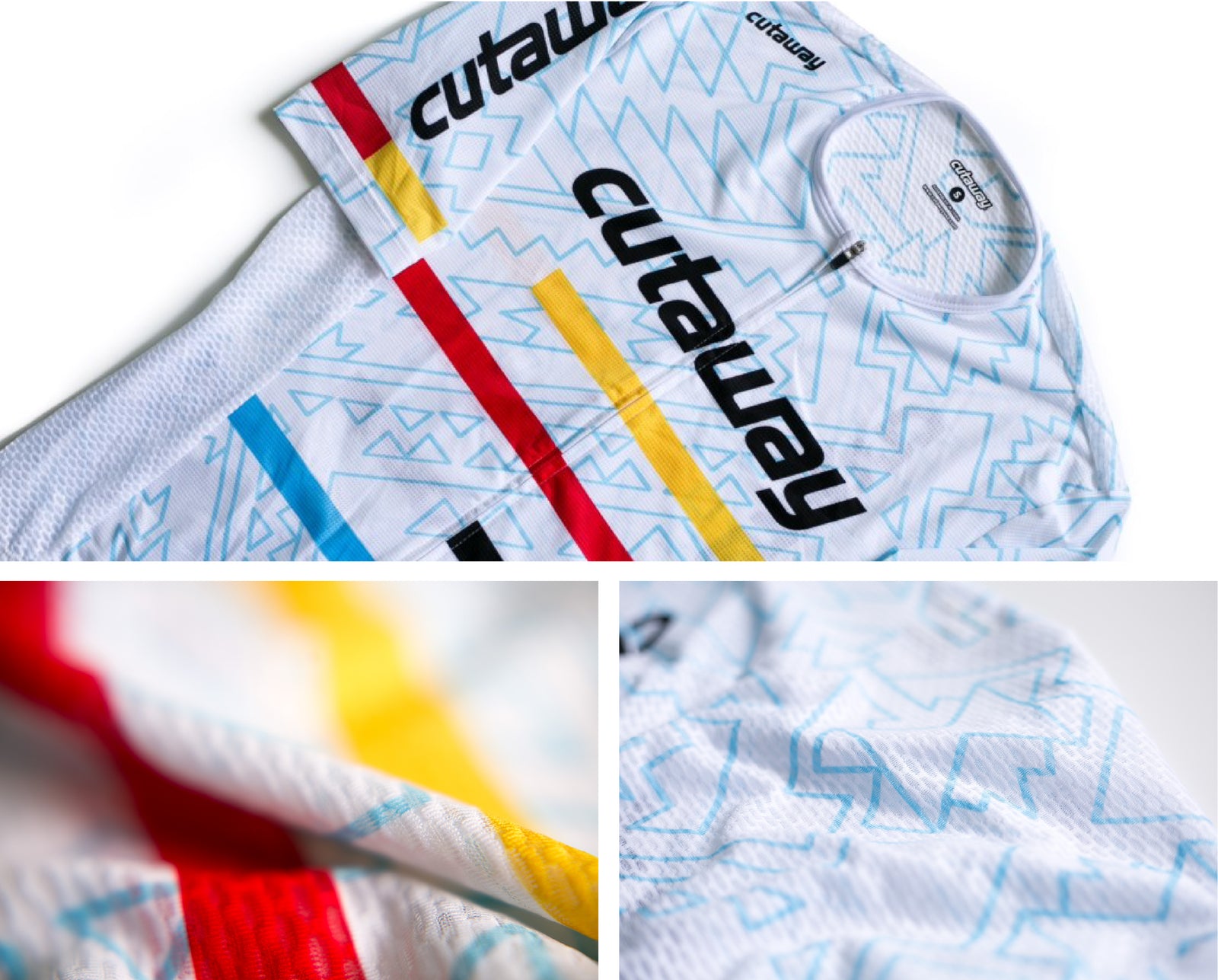 In creating the jersey for the Belgian Waffle Ride, we wanted to mix the iconic colorways of Belgium--red, yellow, and the baby blue that is often used in Belgian national team jerseys--and pair that with something that had a festive Cinco de Mayo feel. So, in combining these two distinctive and very different styles and color palettes, I came up with a modern Belgian themed design with a subtle underlying Cinco de Mayo inspired pattern: these two design elements work together very well in how they are composed of sharp, linear angles and straight lines.